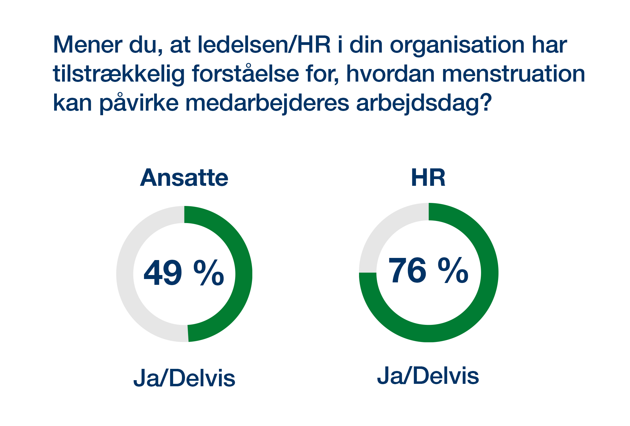 Kun 49 % af de ansatte mener, at deres ledelse har en vis forståelse for, hvordan menstruation påvirker arbejdsdagen. Omvendt vurderer 76 % i HR, at der er en forståelse for problematikken.