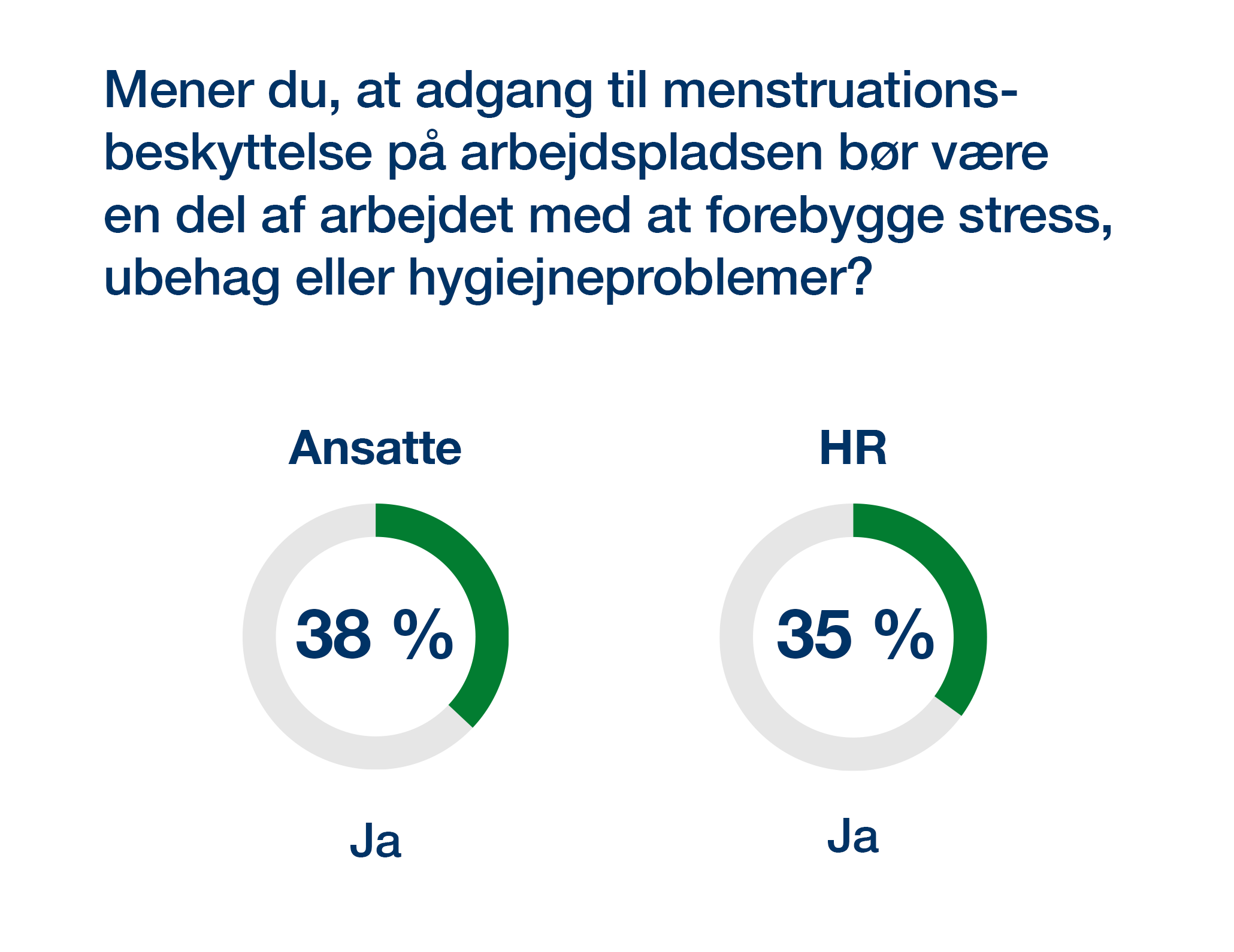 Arbejdsmiljøloven fastslår, at arbejdsgivere skal træffe foranstaltninger for at forebygge helbredsproblemer. Lidt over hver tredje ansatte (38 %) mener, at adgang til menstruationsbeskyttelse bør være en del af dette arbejde, og blandt yngre (18–33 år) er tallet endnu højere: 59 %. 35 % af HR-ansvarlige er enige i, at menstruationsbeskyttelse bør være en del af arbejdsmiljøindsatsen.