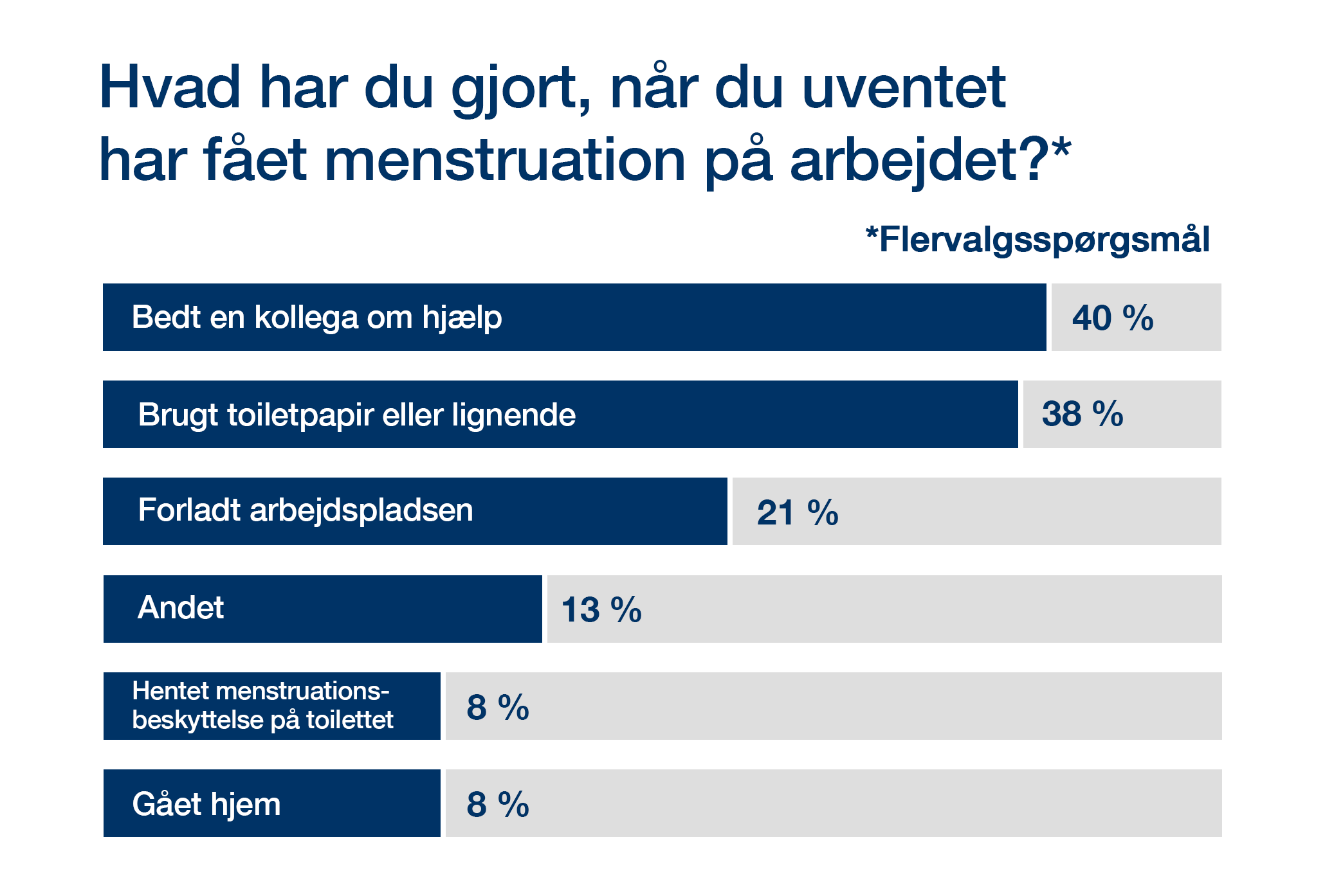 Når menstruationsbeskyttelse mangler på arbejdspladsen, får det tydelige konsekvenser. 38 % har været nødt til at bruge toiletpapir eller lignende som midlertidig beskyttelse, og 21 % har været nødt til at forlade arbejdspladsen for at købe beskyttelse.